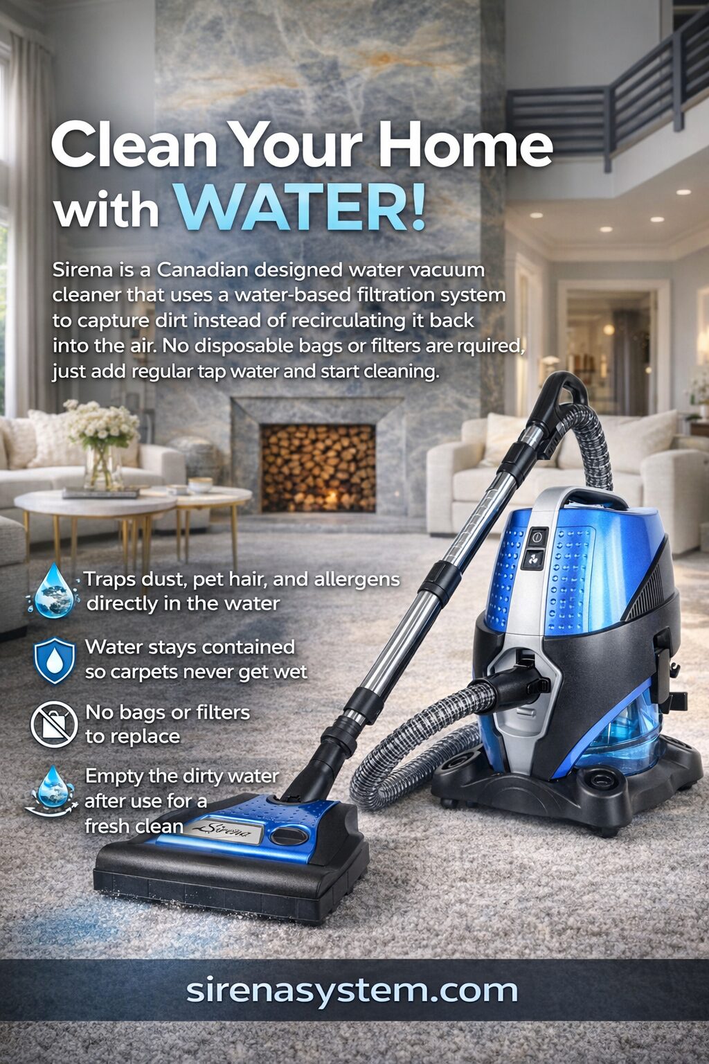 Sirena is a Canadian designed water vacuum cleaner that uses a water-based filtration system to capture dirt instead of recirculating it back into the air. No disposable bags or filters are required, just add regular tap water and start cleaning.