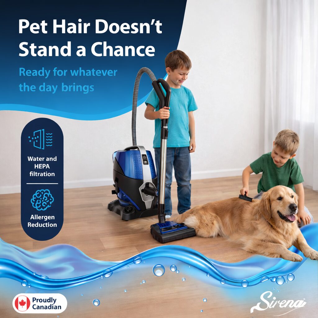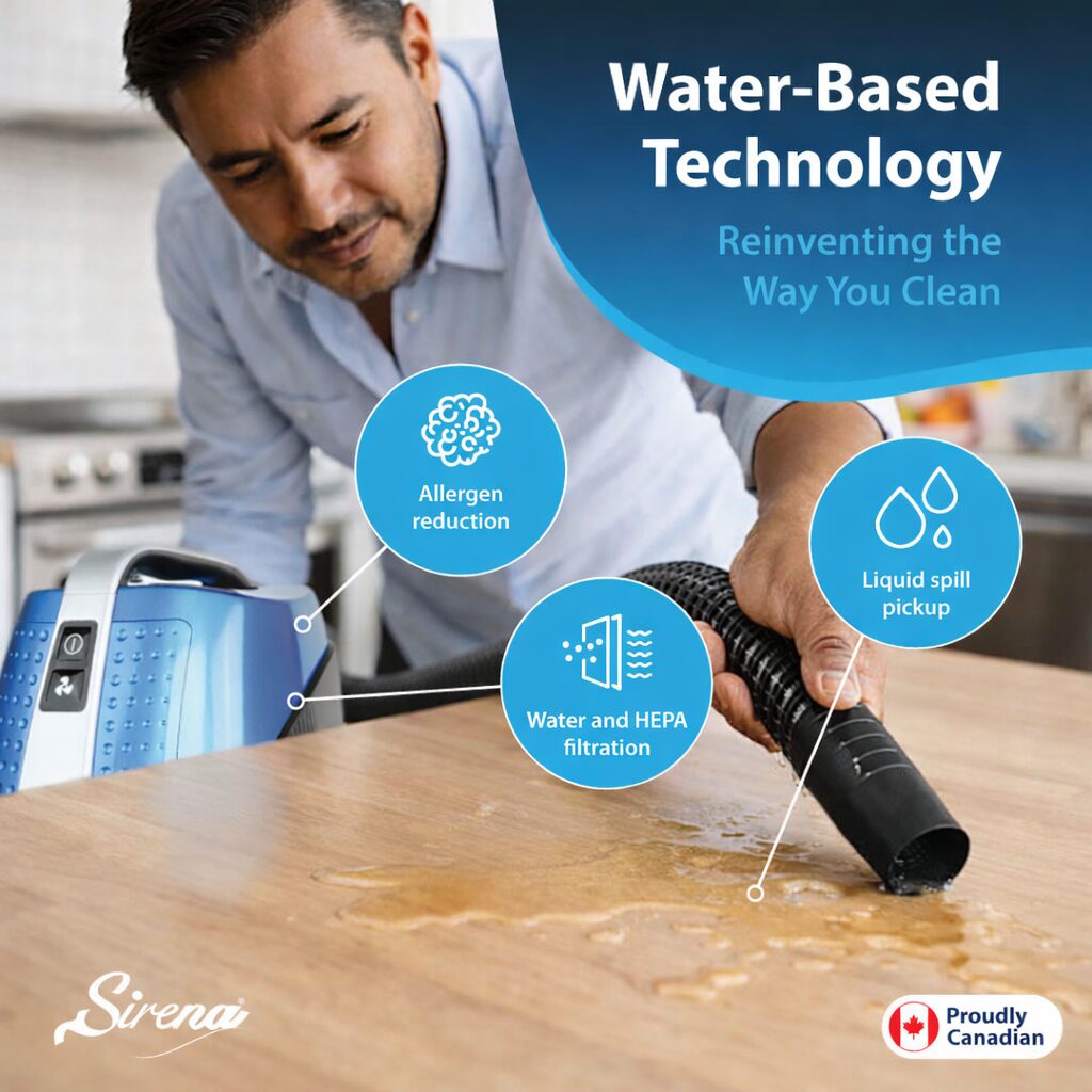 Sirena is a Canadian designed water vacuum cleaner that uses a water-based filtration system to capture dirt instead of recirculating it back into the air. No disposable bags or filters are required, just add regular tap water and start cleaning.